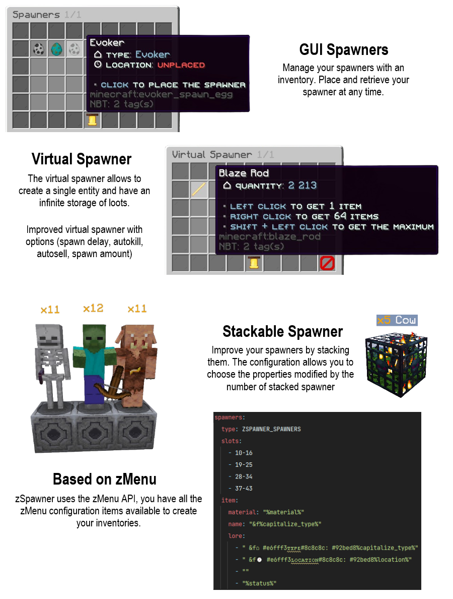 - 3 spawners type. CLASSIC, GUI and VIRTUAL